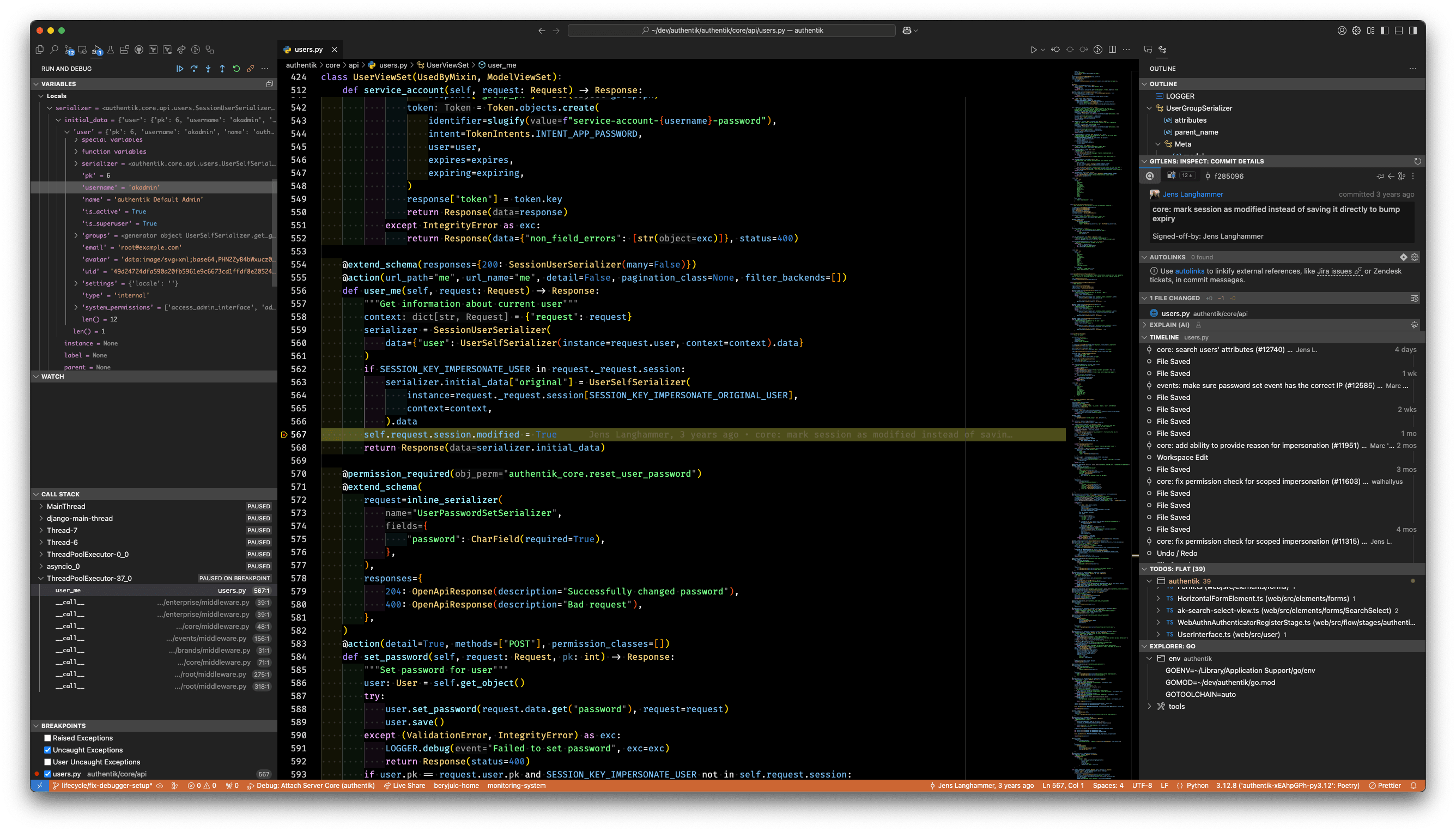 Note that authentik uses debugpy, which relies on the "Debug Adapter Protocol" (DAP). These instructions demonstrate debugging using Visual Studio Code, however they should be adaptable to other editors that support DAP.